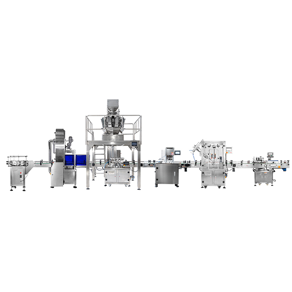 本款灌裝機(jī)是一款針對顆粒狀的花生米、花生仁、堅(jiān)果類、顆粒固體類進(jìn)行灌裝到瓶子當(dāng)中的機(jī)械設(shè)備,該機(jī)由:多頭秤定量機(jī)、全自動易拉罐封口機(jī)、全自動壓蓋機(jī)、高速旋蓋機(jī)、全自動貼標(biāo)機(jī)組成的一條生產(chǎn)線。該機(jī)采用PLC控制,無需人工參與!機(jī)械自動下料、自動填充,自動封口貼標(biāo)。