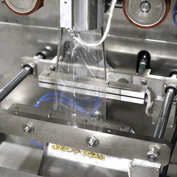這款膨化食品包裝機(jī)械設(shè)備可以實(shí)現(xiàn)自動送料、稱重計(jì)量、制袋、充填、封口、打印日期和成品輸出等一系列步驟,無需人工干預(yù),除了最開始需要人工倒入物料以外,其余環(huán)節(jié)都是全自動完成。