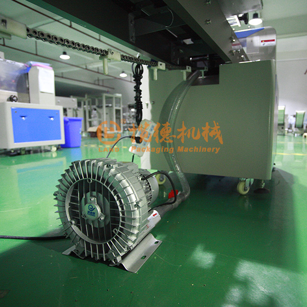 2、這臺口罩包裝機跟以往的有所不同,以往的是在端封裁切區(qū)加海綿進行排氣處理,而這款是在熱中封區(qū)域加裝一個漩渦氣泵進行抽氣處理。傳統(tǒng)海綿排氣,一周就要換一次海綿,換上這個裝置以后,就不需要海綿了,效率更高。采用上走膜的方式輸送卷膜,掛膜方便,調(diào)節(jié)簡單。